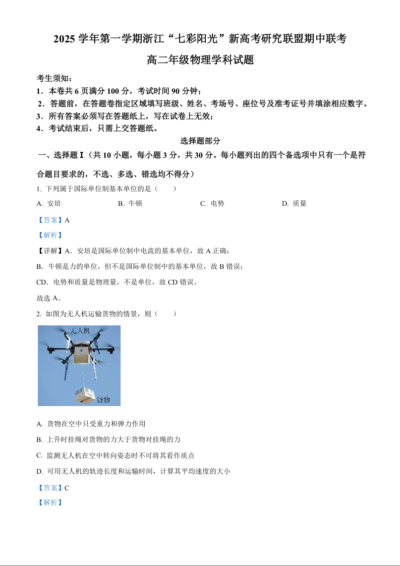 浙江省”七彩阳光“新高考研究联盟2025-2026学年高二上学期期中联考试 物理答案.docx
