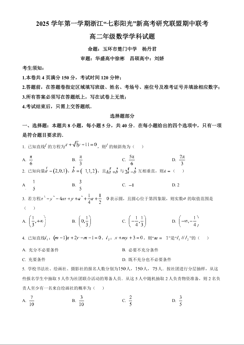 浙江省”七彩阳光“新高考研究联盟2025-2026学年高二上学期期中联考试 数学.docx