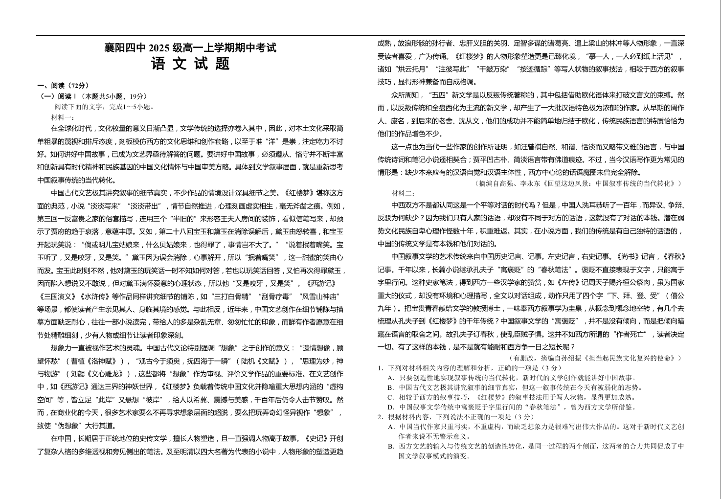 湖北省襄阳市第四中学2025-2026学年高一年级期中考试 语文试卷(含答案).docx