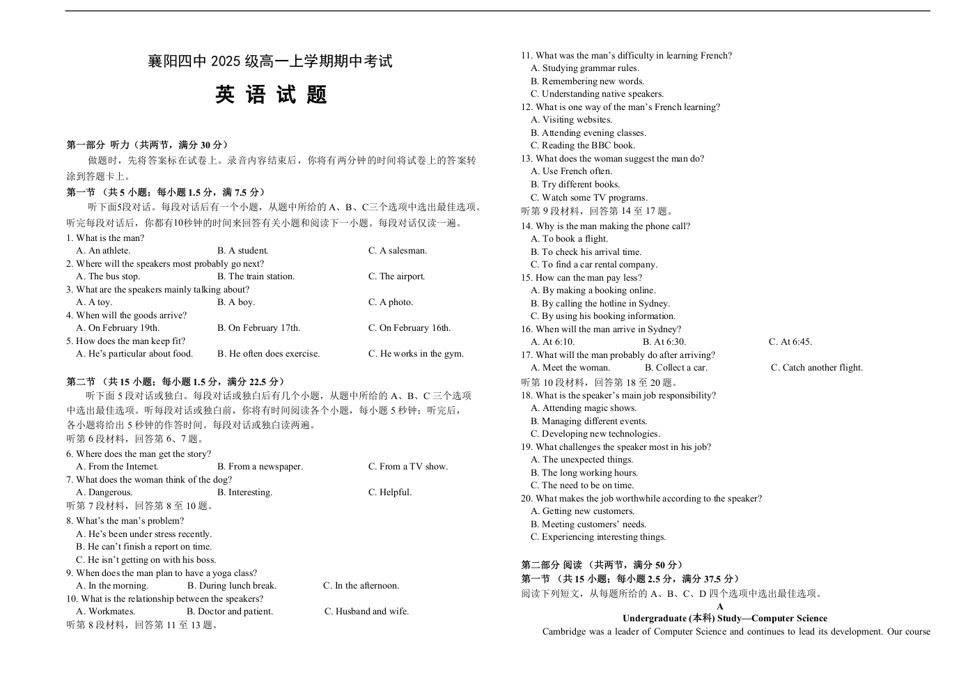 湖北省襄阳市第四中学2025-2026学年高一年级期中考试 英语试卷(含答案).docx