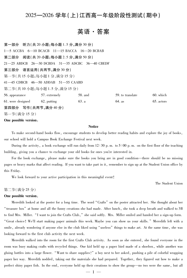 英语-江西高一上期中答案.pdf
