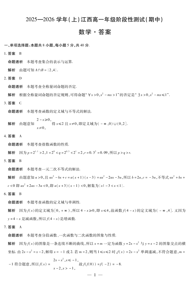 数学-江西高一上期中详细答案.pdf