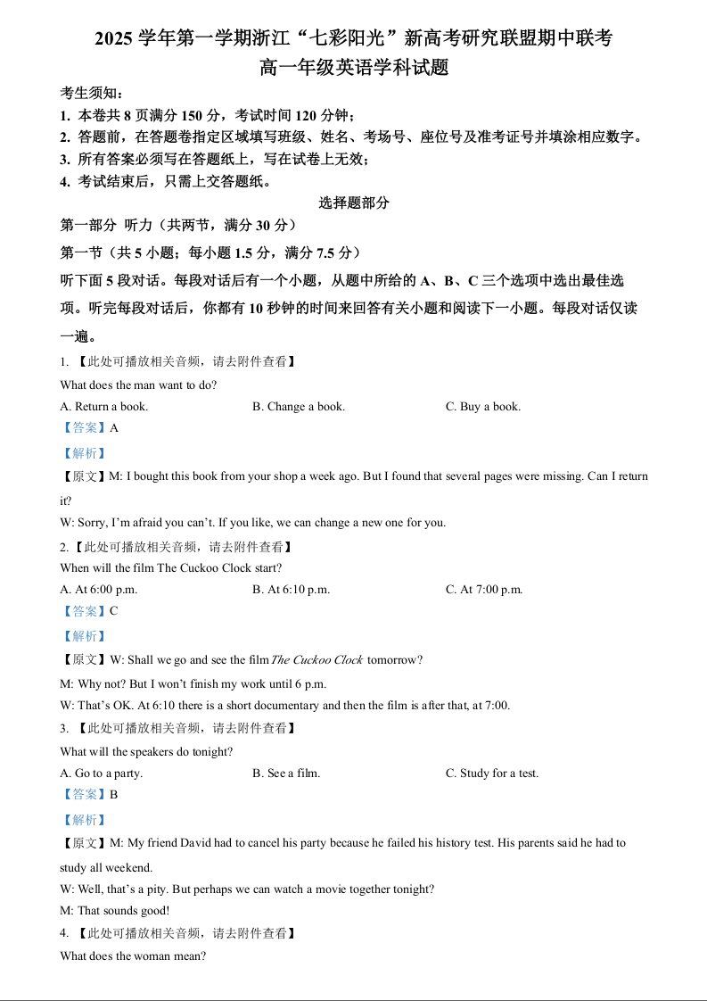 浙江省“七彩阳光”新高考研究联盟2025-2026学年高一上学期期中联考 英语答案.docx