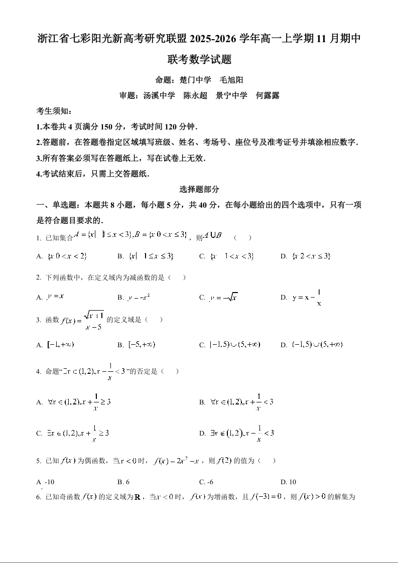 浙江省“七彩阳光”新高考研究联盟2025-2026学年高一上学期期中联考 数学.docx