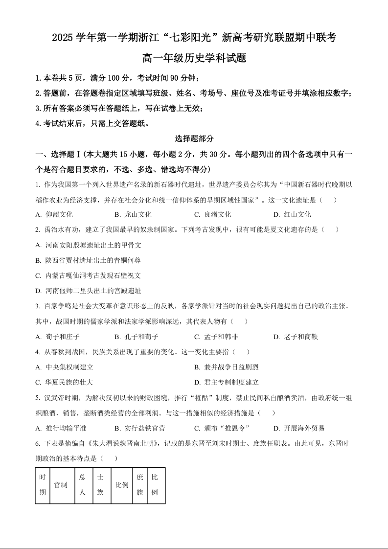 浙江省“七彩阳光”新高考研究联盟2025-2026学年高一上学期期中联考 历史.docx