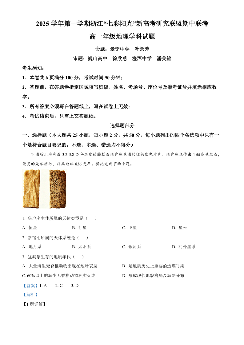 浙江省“七彩阳光”新高考研究联盟2025-2026学年高一上学期期中联考 地理答案.docx