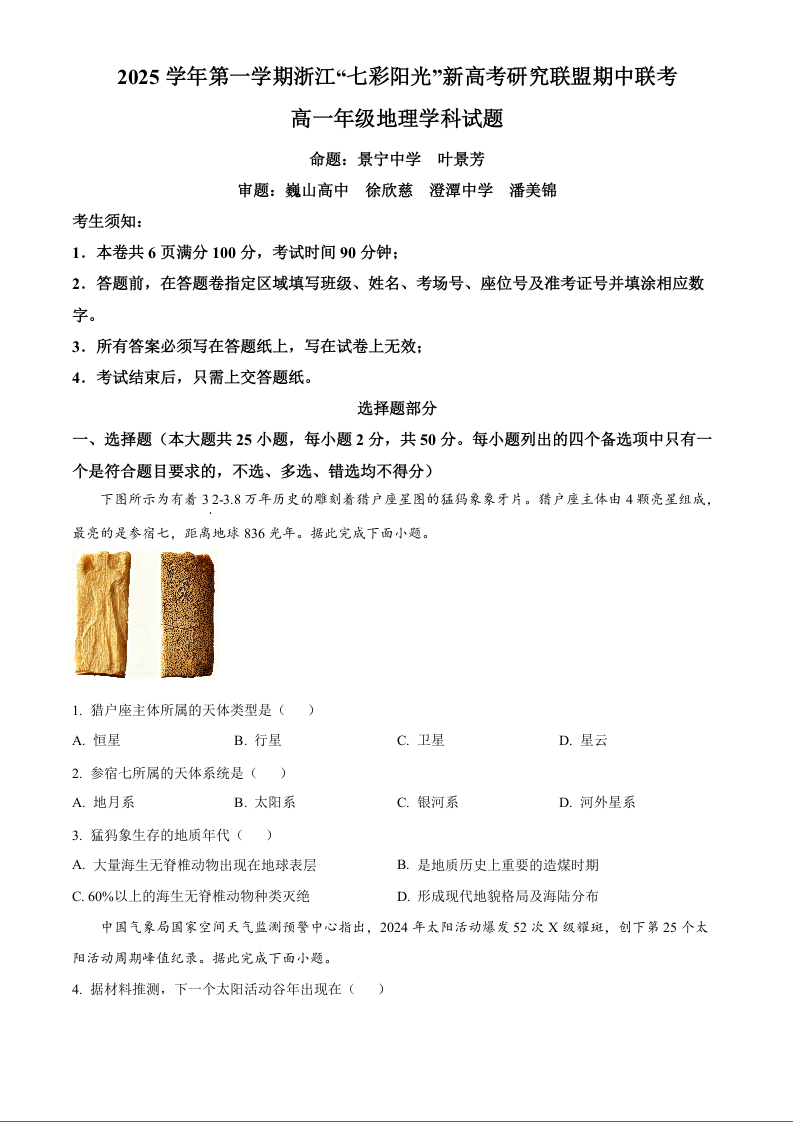 浙江省“七彩阳光”新高考研究联盟2025-2026学年高一上学期期中联考 地理.docx