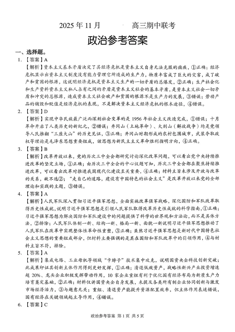 2025年11月A佳教育高三期中联考 政治答案.pdf