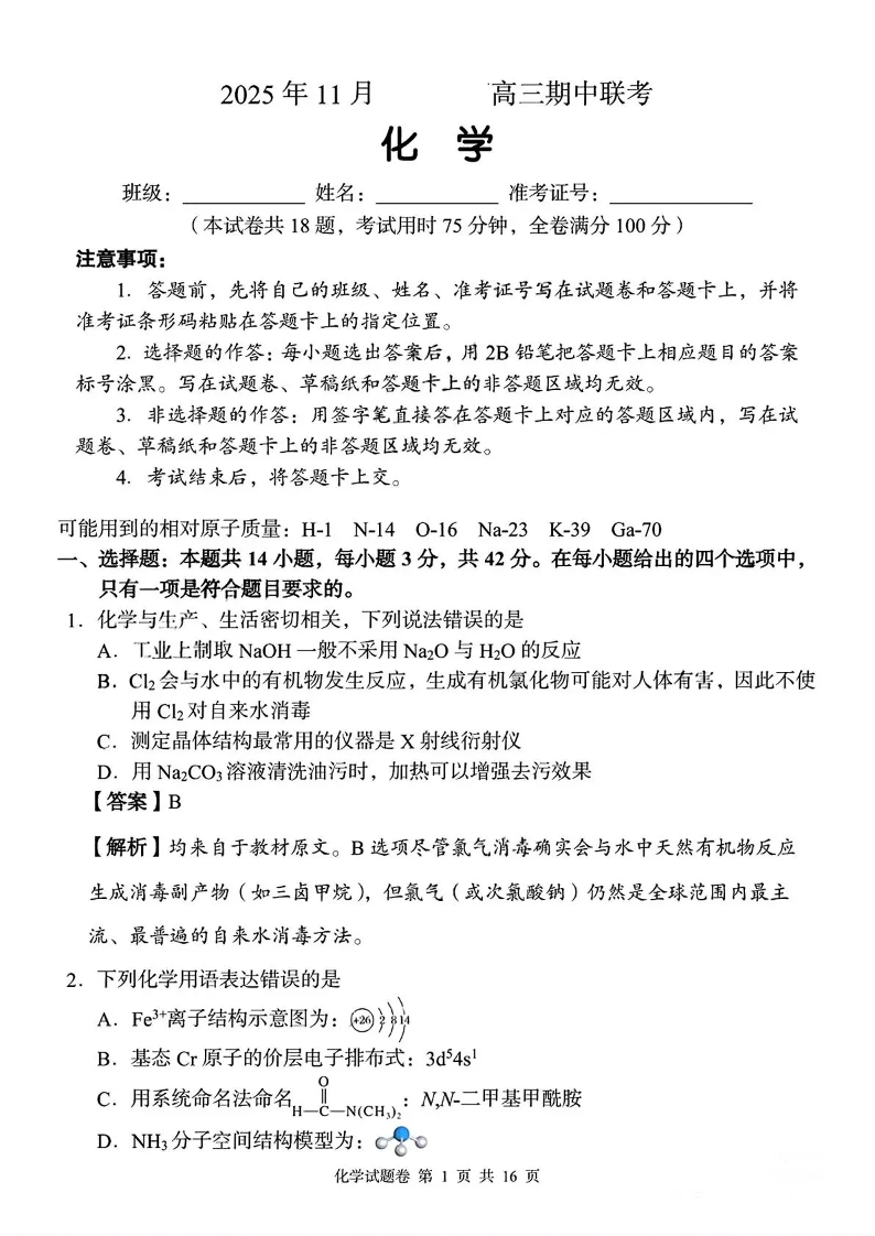 2025年11月A佳教育高三期中联考 化学答案.pdf