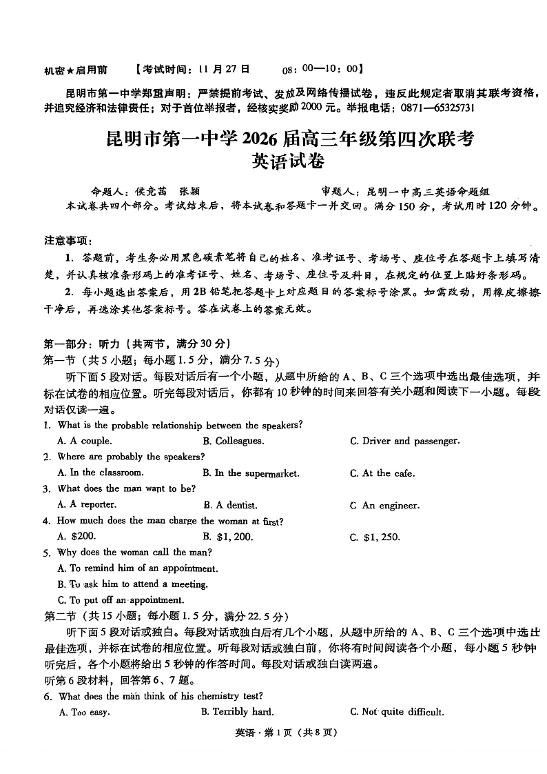 昆明市第一中学2026届高三年级第四次联考 英语.pdf