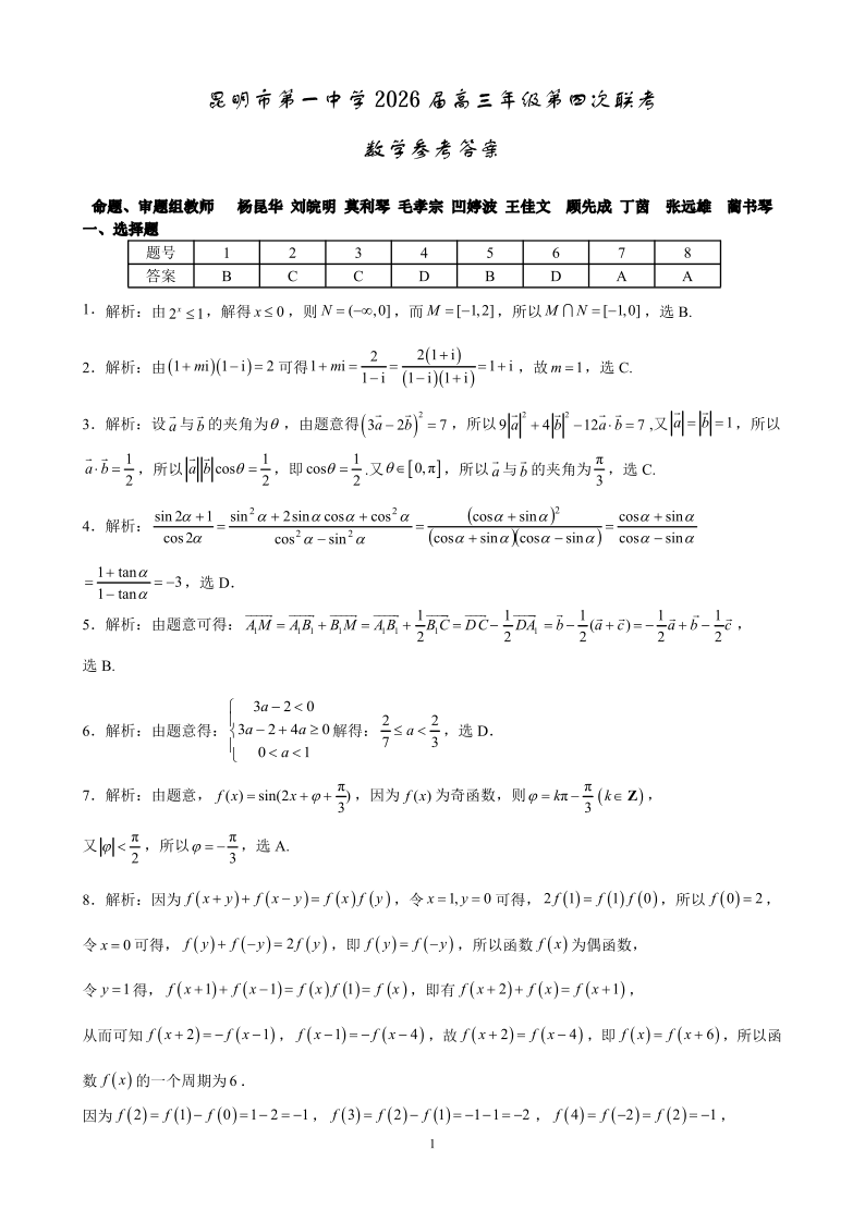 昆明市第一中学2026届高三年级第四次联考 数学答案.pdf
