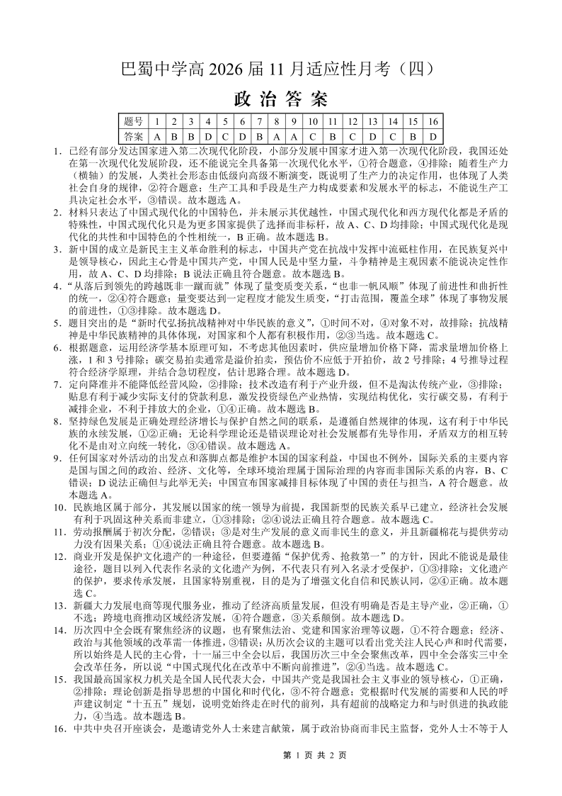 巴蜀中学2026届高考适应性月考卷(四)政治答案.pdf