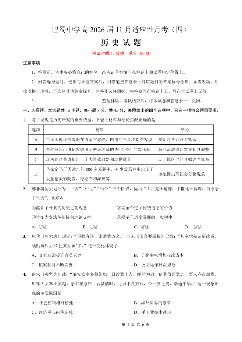 巴蜀中学2026届高考适应性月考卷(四)历史.pdf