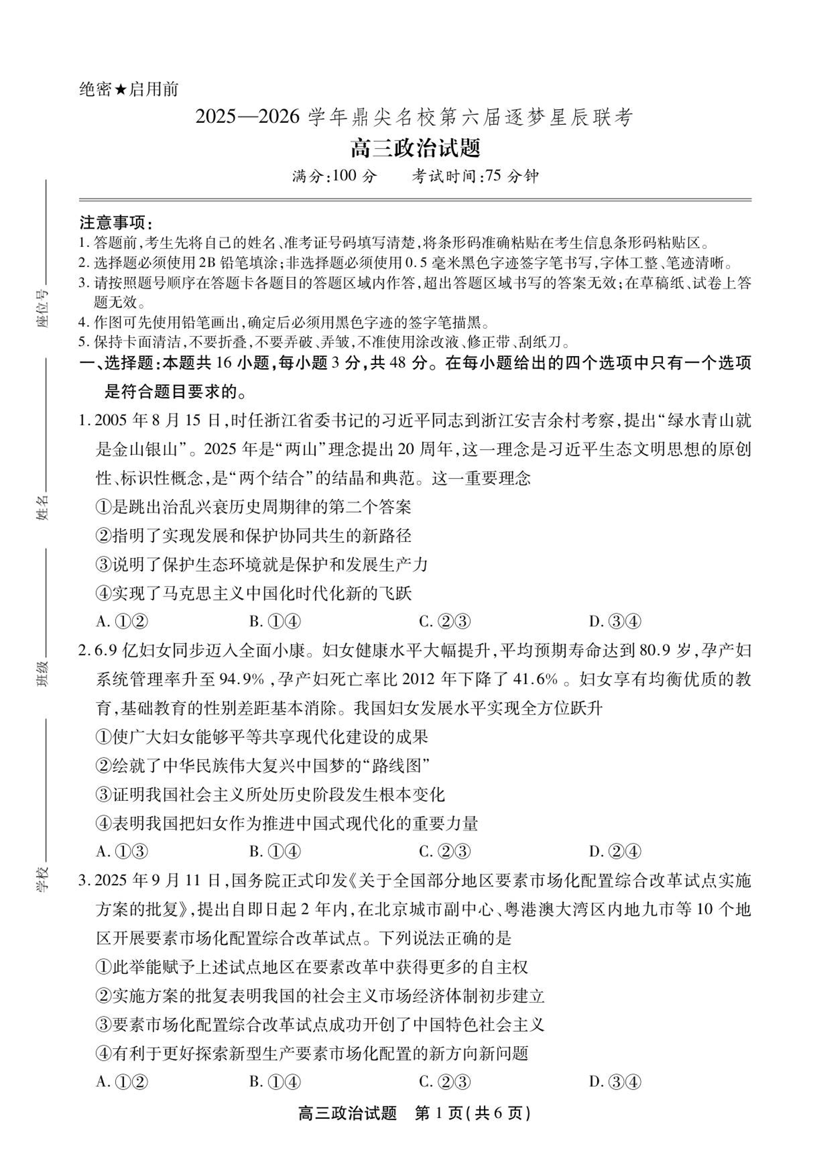 安徽省2025-2026学年鼎尖名校第六届逐梦星辰联考 政治.pdf