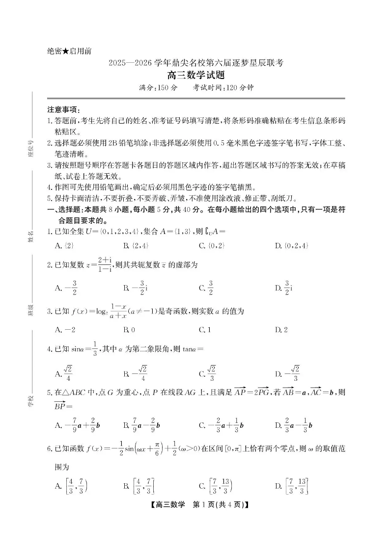 安徽省2025-2026学年鼎尖名校第六届逐梦星辰联考 数学.pdf