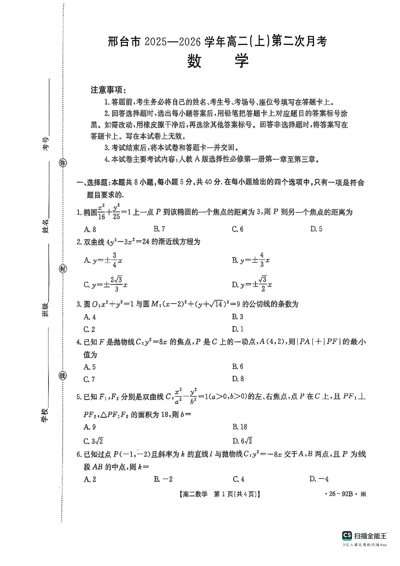 邢台市2025-2026学年高二(上)第二次月考 数学试题(含答案).pdf