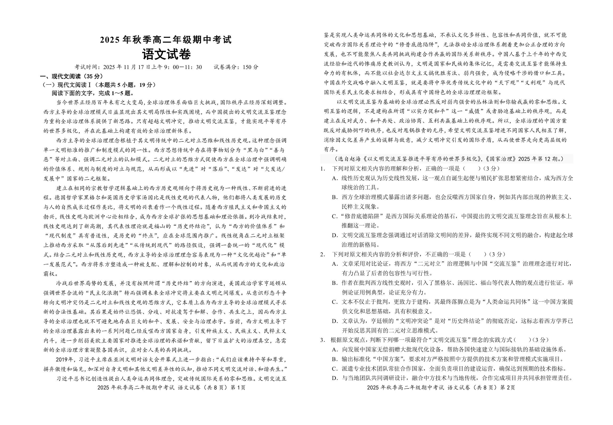 湖北省鄂东南省级示范高中教育教学改革联盟2025年秋季高二年级期中考试 语文.pdf