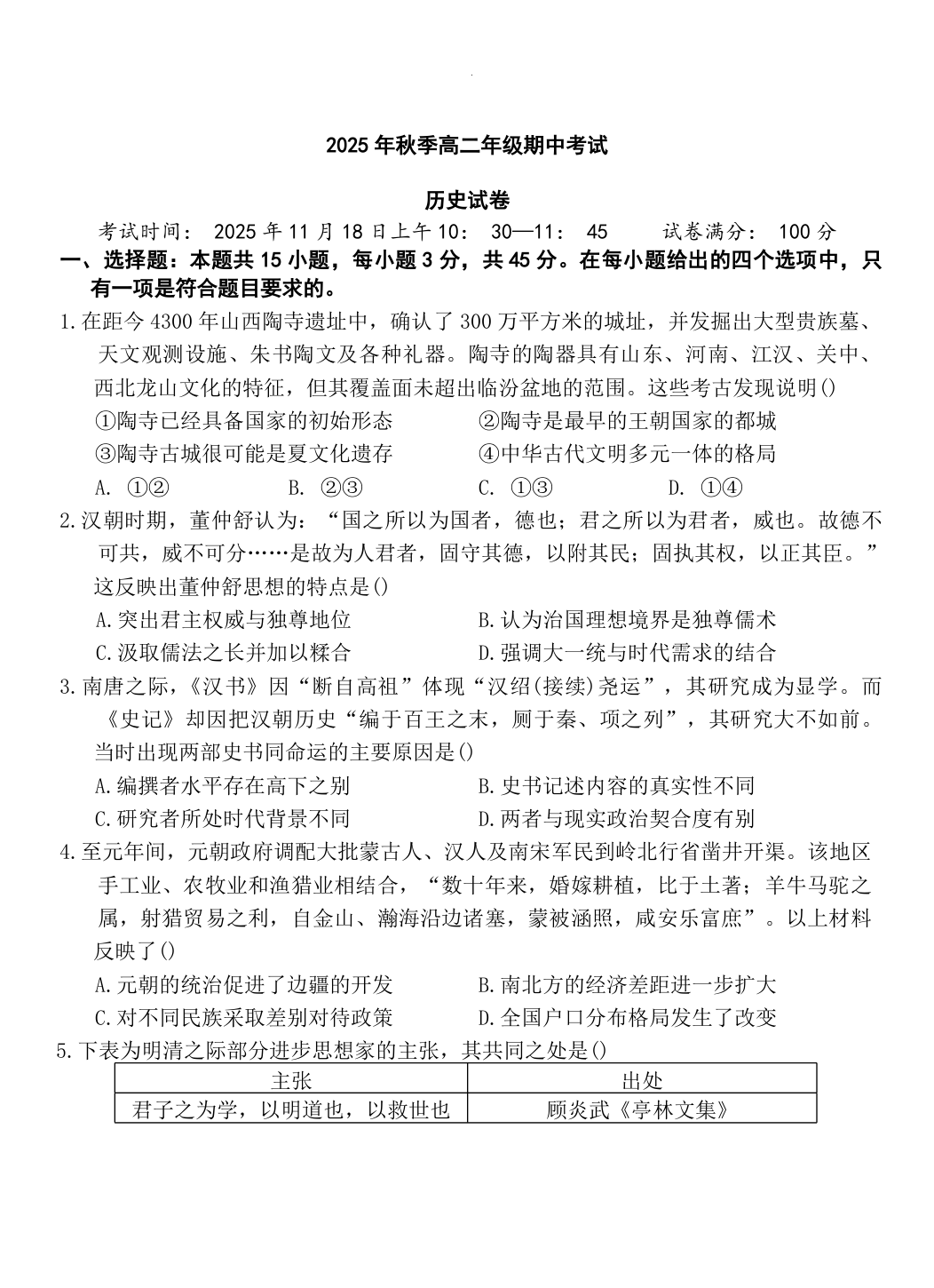 湖北省鄂东南省级示范高中教育教学改革联盟2025年秋季高二年级期中考试 历史试题(含答案).docx