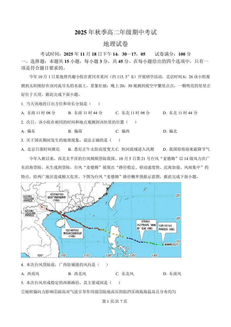 湖北省鄂东南省级示范高中教育教学改革联盟2025年秋季高二年级期中考试 地理试题(含答案).docx