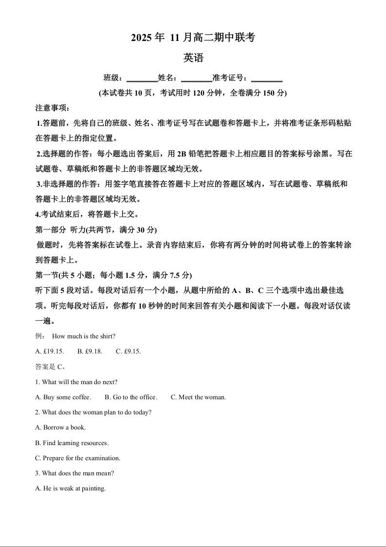 2025年11月A佳教育高二期中联考 英语.docx