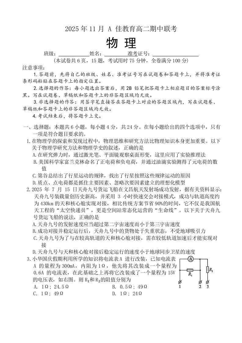 2025年11月A佳教育高二期中联考 物理.docx