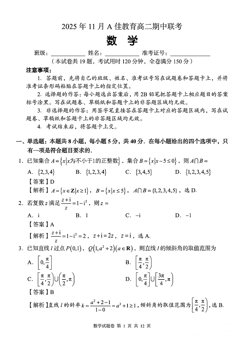 2025年11月A佳教育高二期中联考 数学答案.pdf
