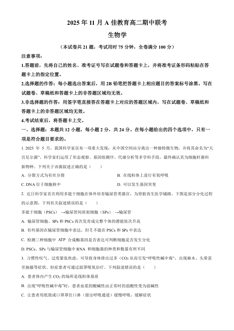 2025年11月A佳教育高二期中联考 生物.docx