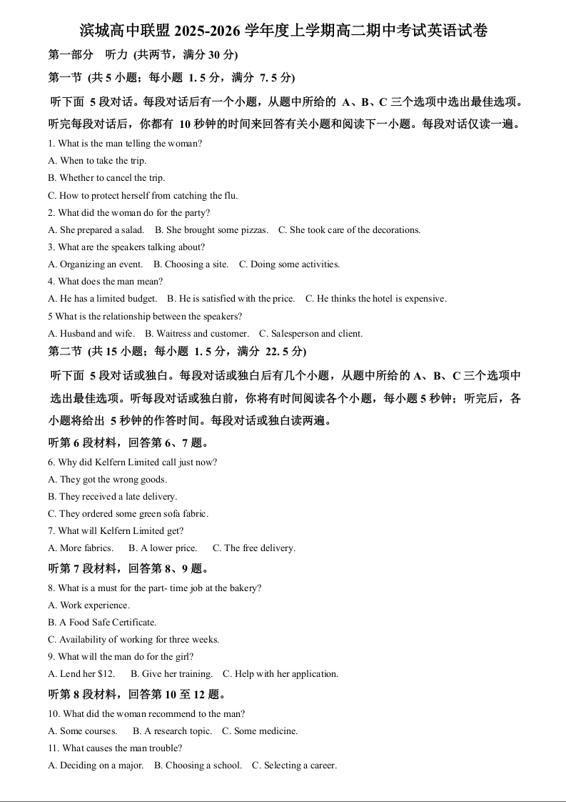 滨城高中联盟2025-2026学年高二上学期期中考试 英语试题(含答案).docx