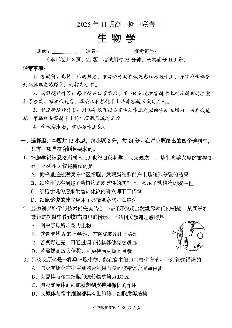 三新协作体2025年11月高一期中联考 生物.pdf
