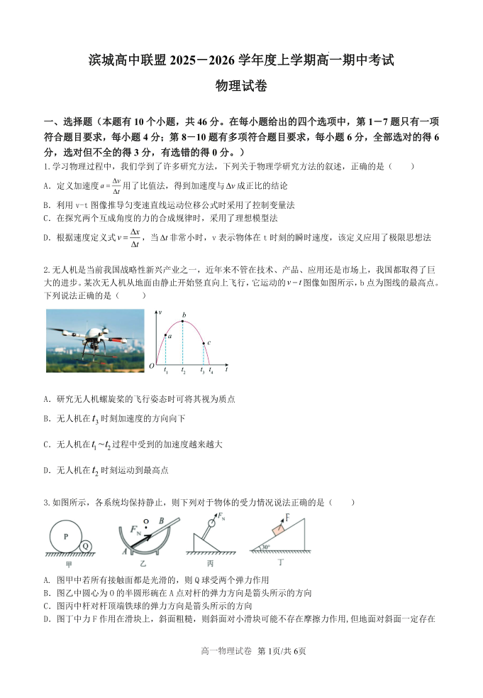 滨城高中联盟2025-2026学年度上学期高一期中考试 物理试卷(含答案).pdf
