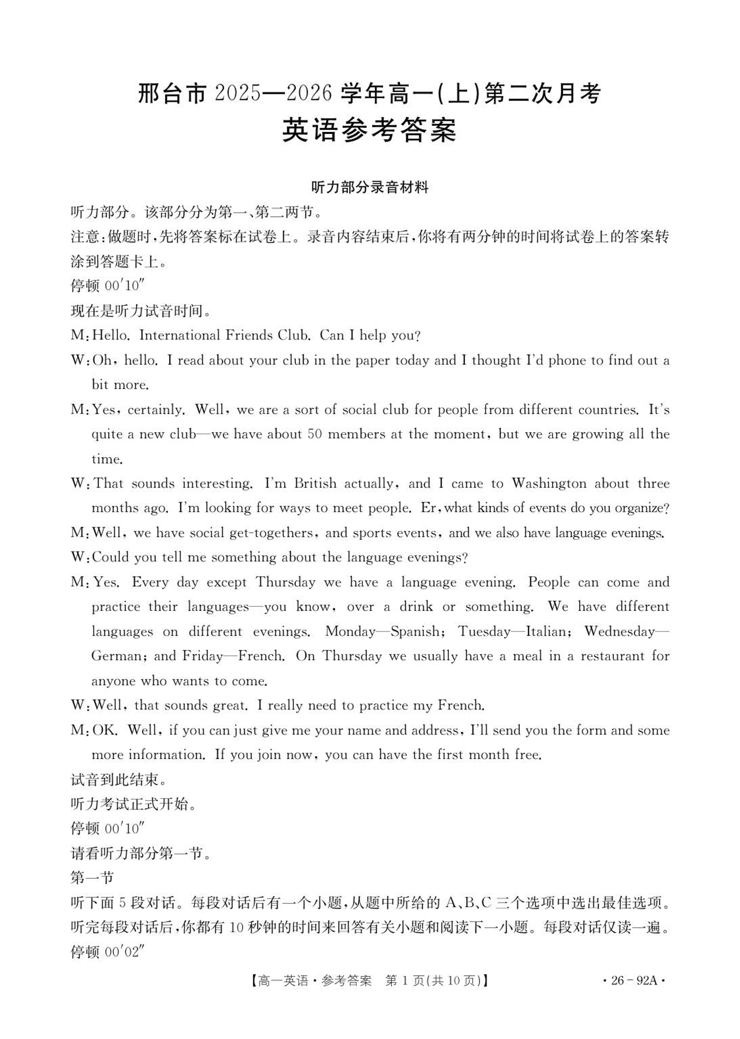 邢台市2025-2026学年高一(上)第二次月考 英语答案.pdf