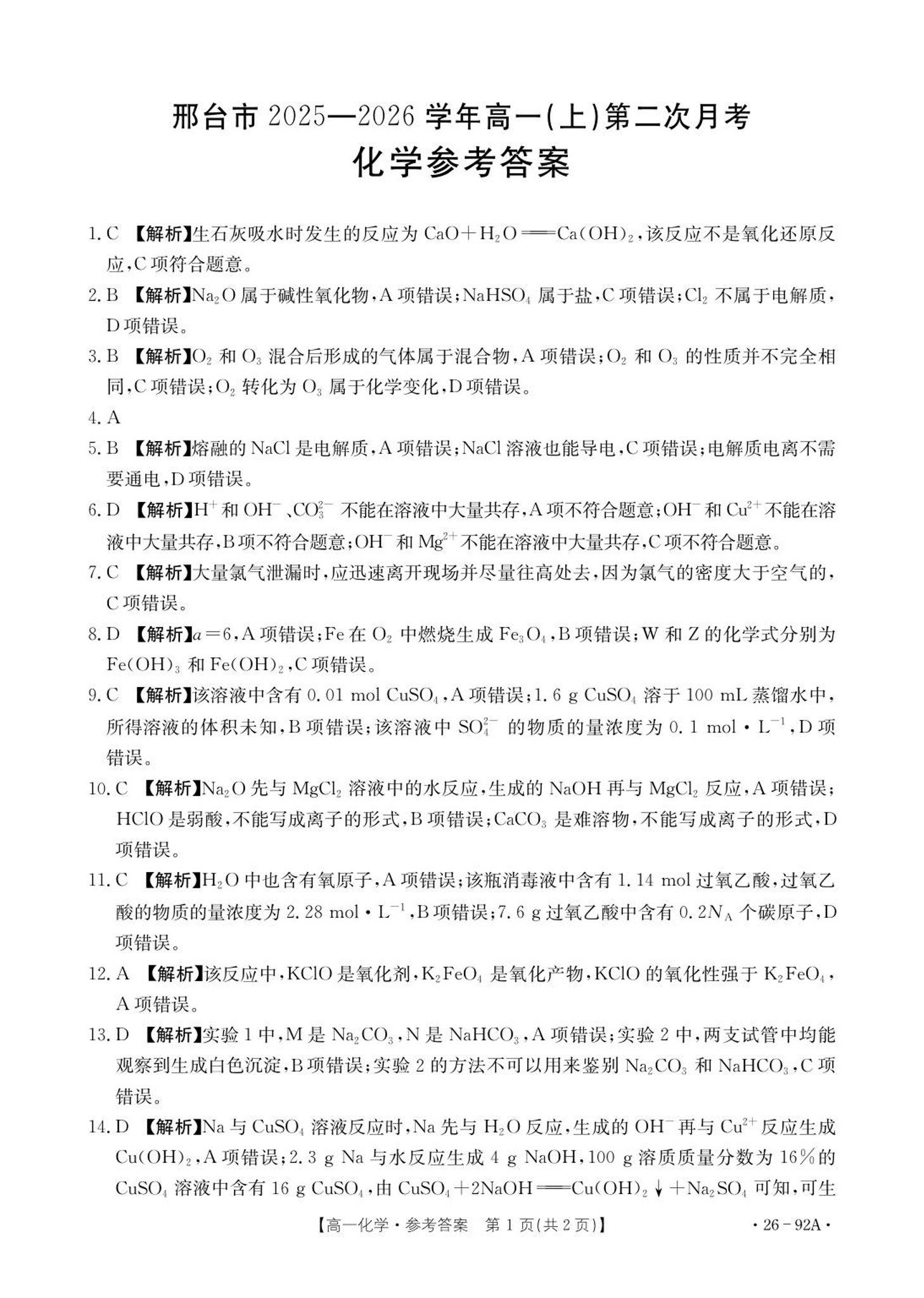 邢台市2025-2026学年高一(上)第二次月考 化学答案.pdf