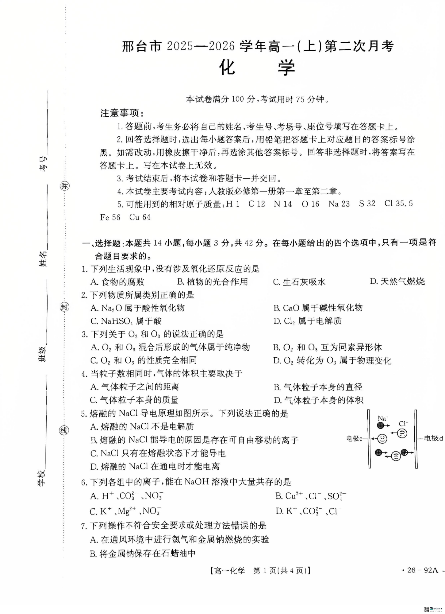 邢台市2025-2026学年高一(上)第二次月考 化学.pdf