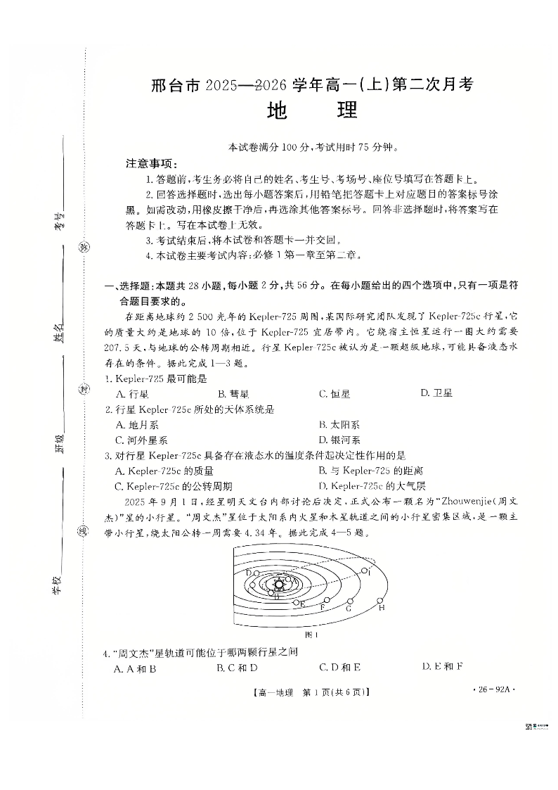 邢台市2025-2026学年高一(上)第二次月考 地理试题(含答案).pdf