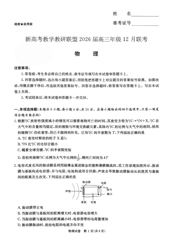 新高考教学教研联盟(长郡二十校)2026届高三年级12月联考 物理.pdf
