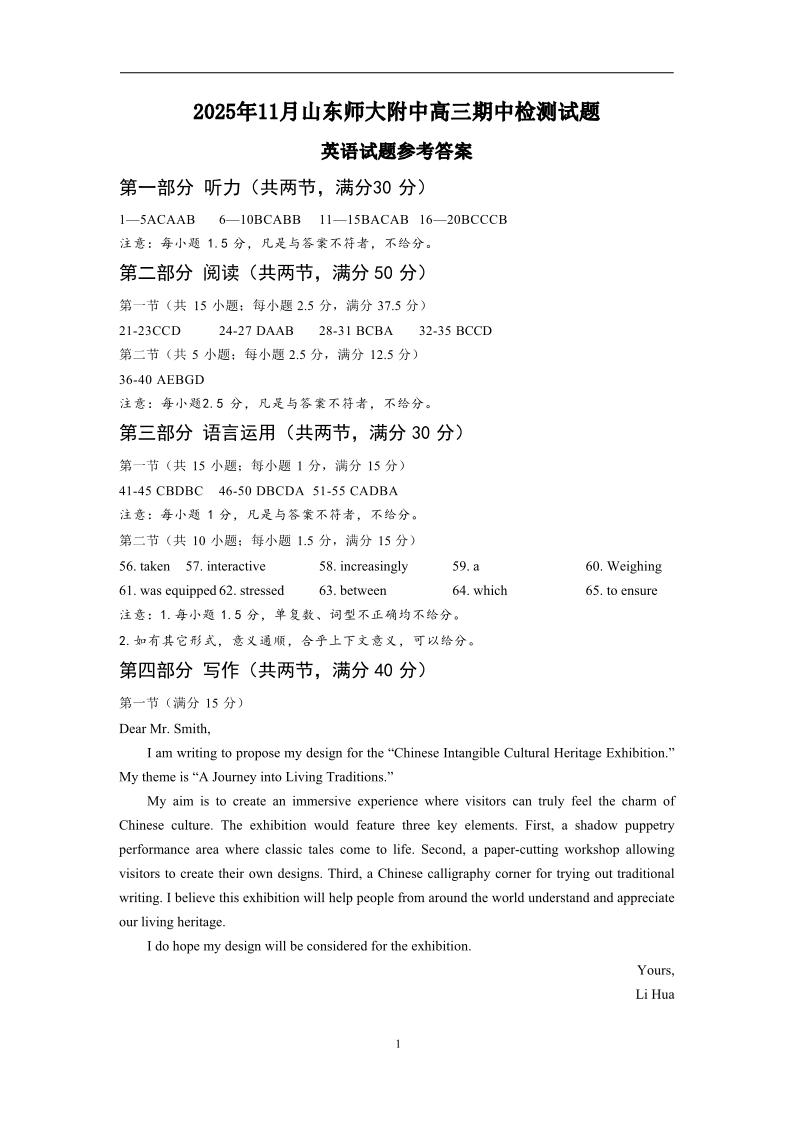 山东师大附中2025年11月高三期中检测 英语答案.pdf