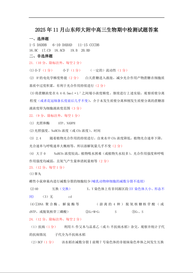 山东师大附中2025年11月高三期中检测 生物答案.docx