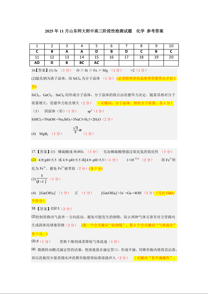 山东师大附中2025年11月高三期中检测 化学评分细则.docx