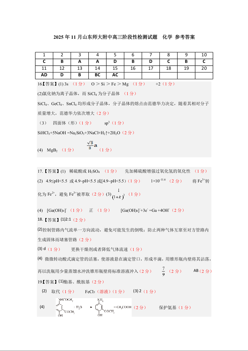 山东师大附中2025年11月高三期中检测 化学答案.docx