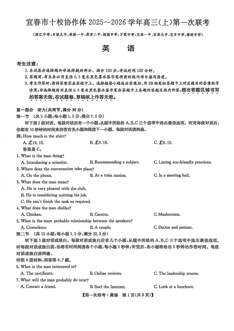 宜春市十校协作体2025~2026学年高三(上)第一次联考 英语.pdf