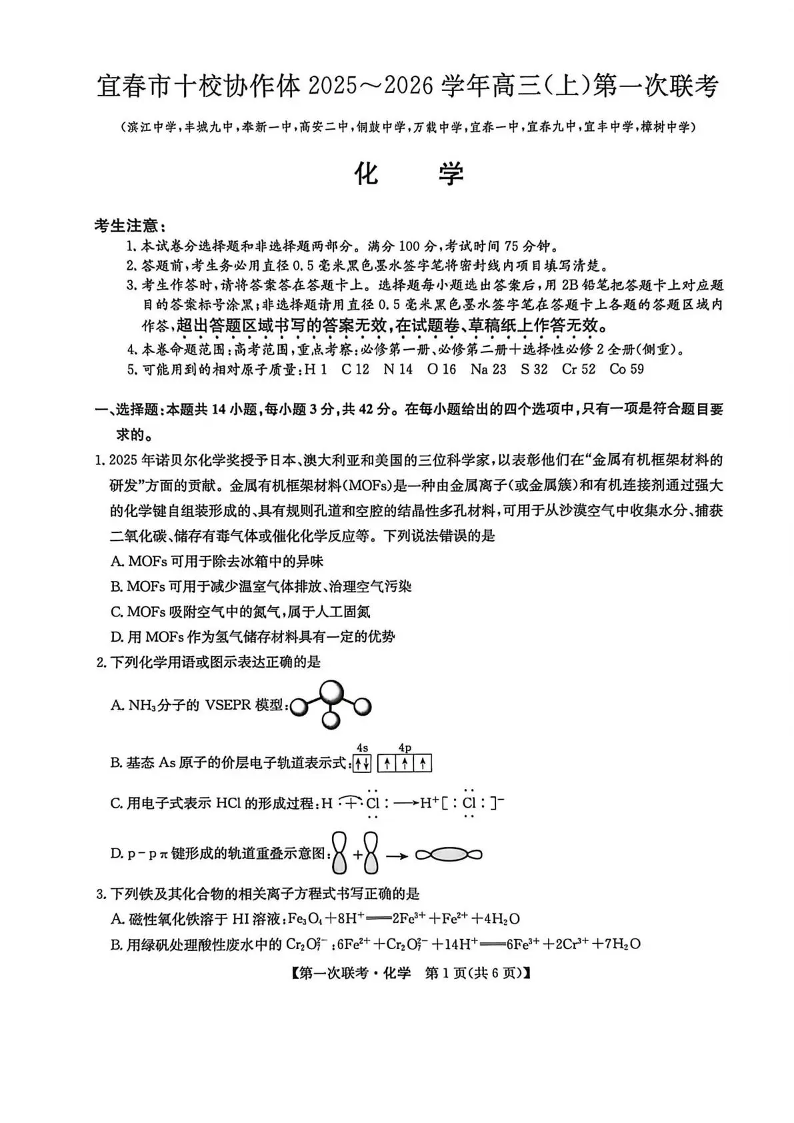 宜春市十校协作体2025~2026学年高三(上)第一次联考 化学.pdf