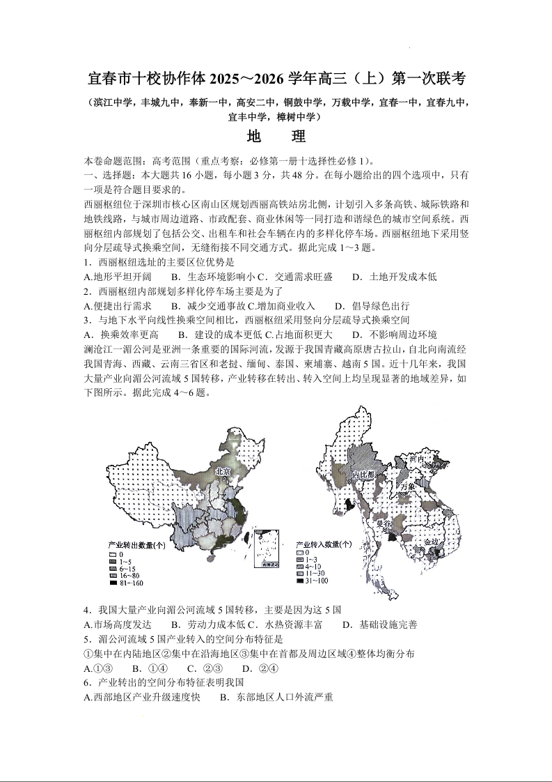 宜春市十校协作体2025~2026学年高三(上)第一次联考 地理.docx