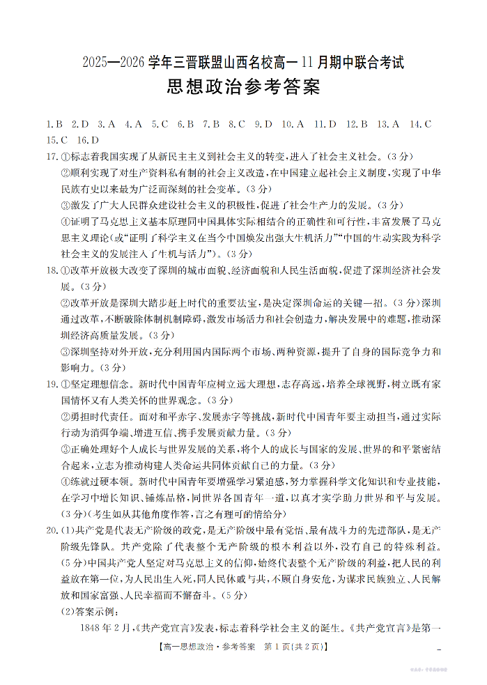 山西省三晋联盟山西名校2025-2026学年高一上学期11月期中联合考试 政治答案.pdf