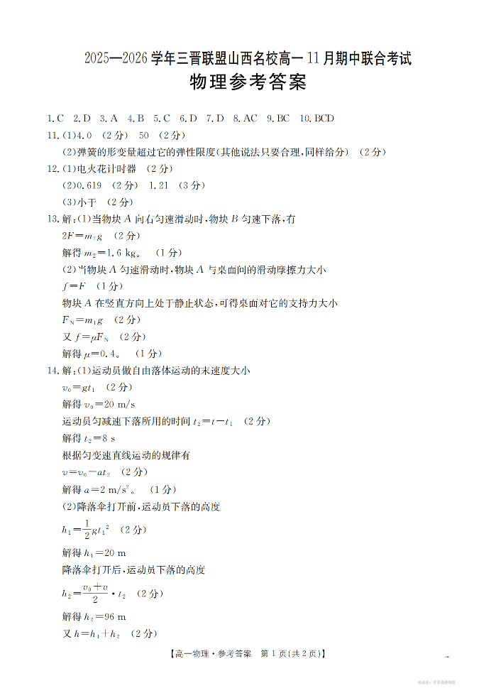 山西省三晋联盟山西名校2025-2026学年高一上学期11月期中联合考试 物理答案.pdf