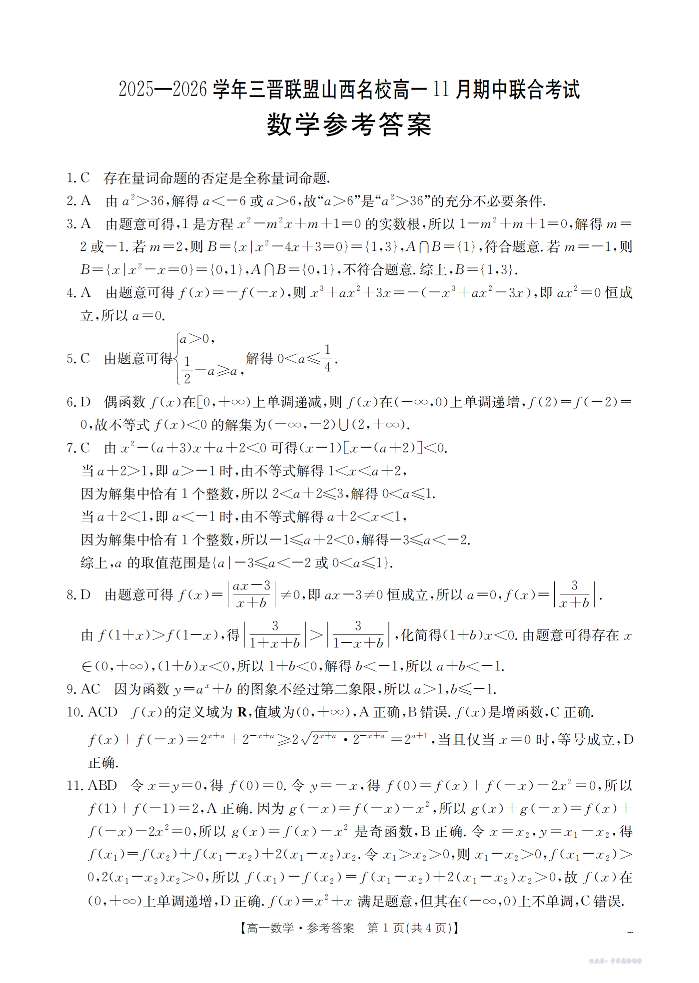 山西省三晋联盟山西名校2025-2026学年高一上学期11月期中联合考试 数学答案.pdf