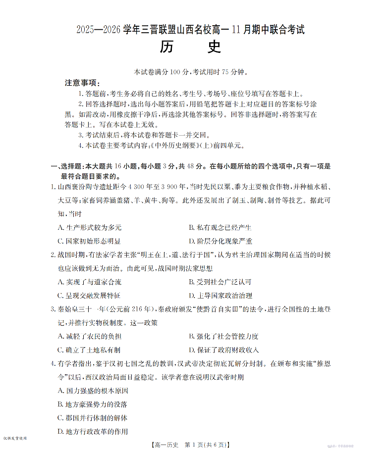山西省三晋联盟山西名校2025-2026学年高一上学期11月期中联合考试 历史.pdf