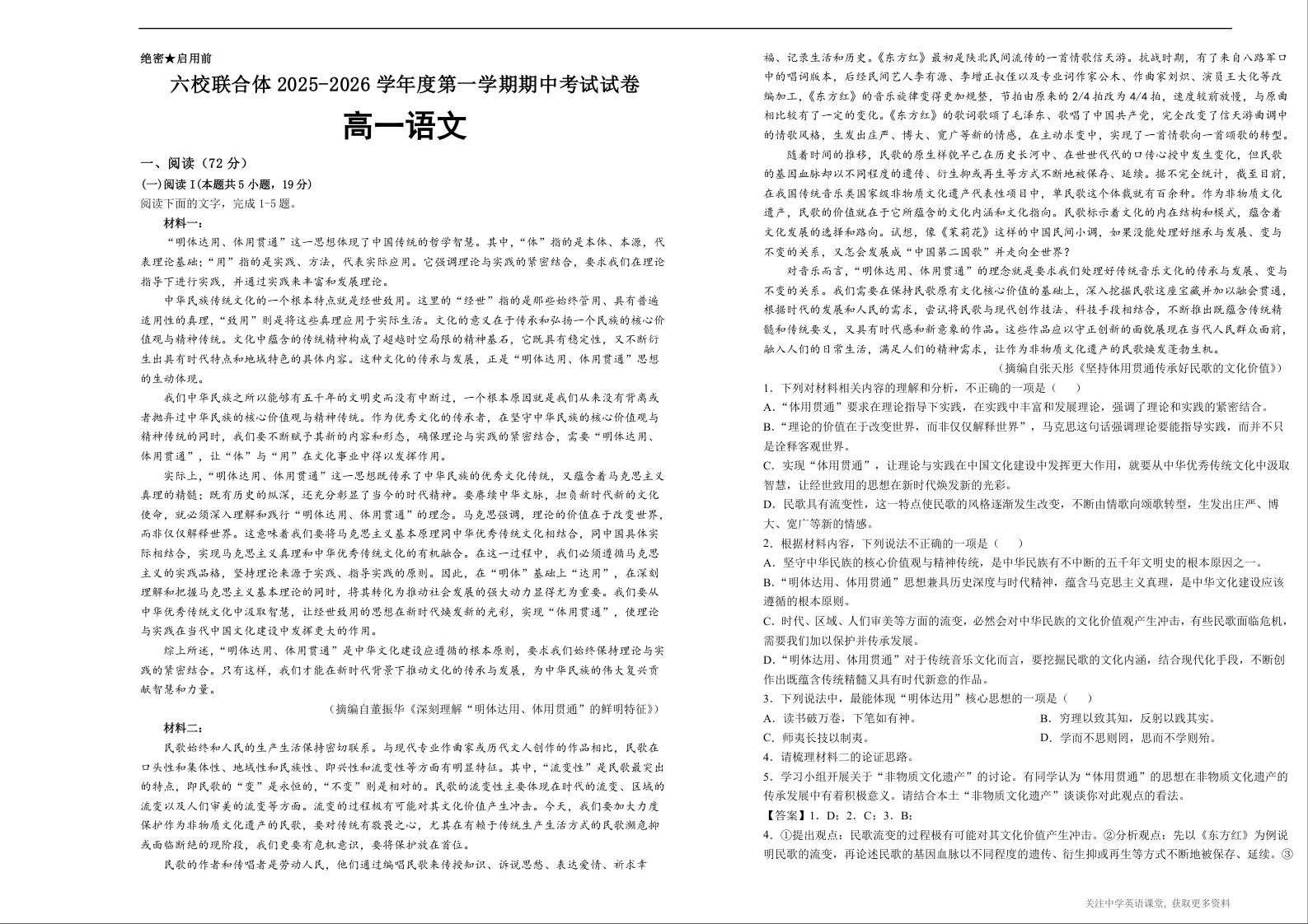 六校联合体2025-2026学年度第一学期期中考试试卷-高一语文答案.docx