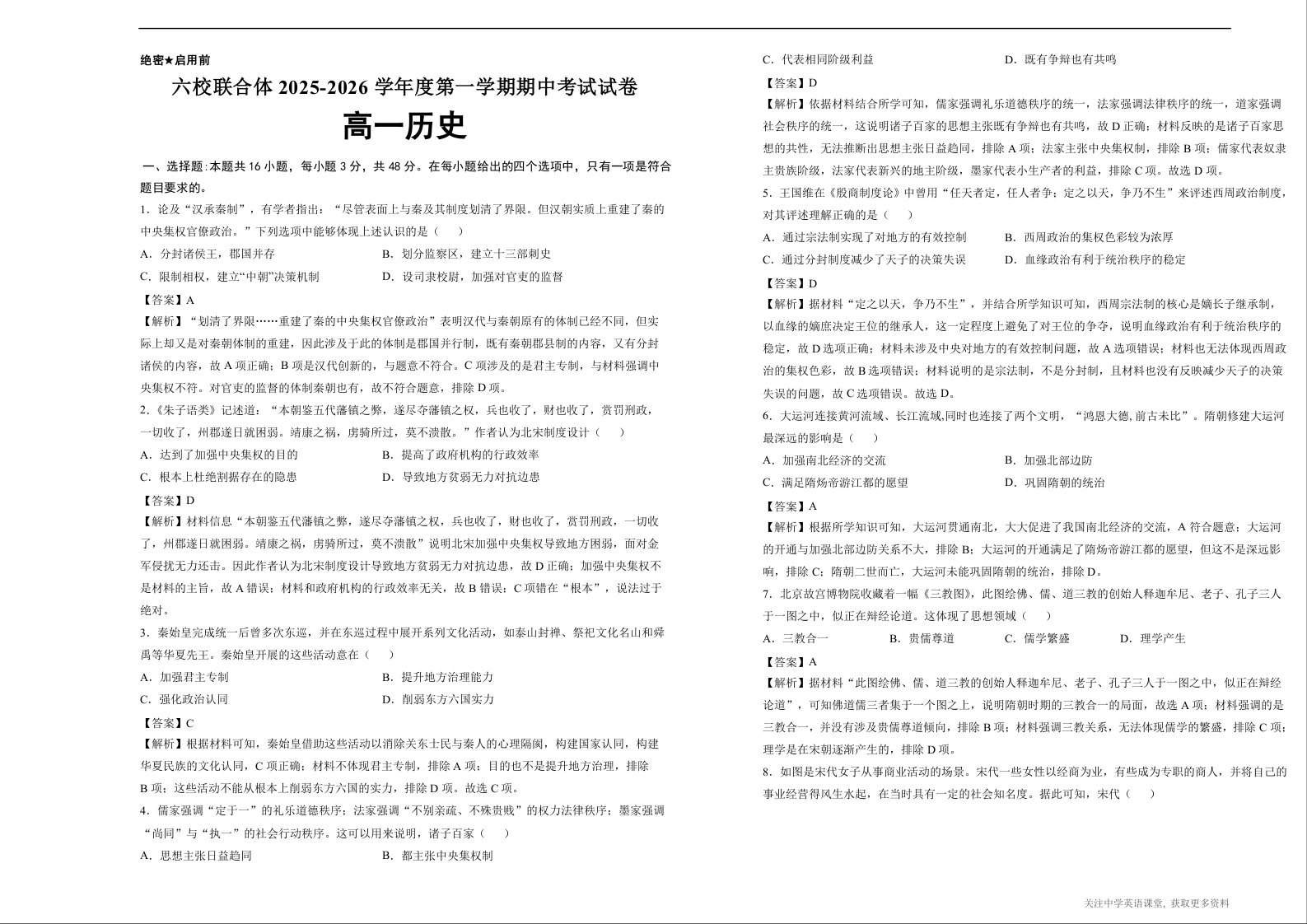 六校联合体2025-2026学年度第一学期期中考试试卷-高一历史答案.docx