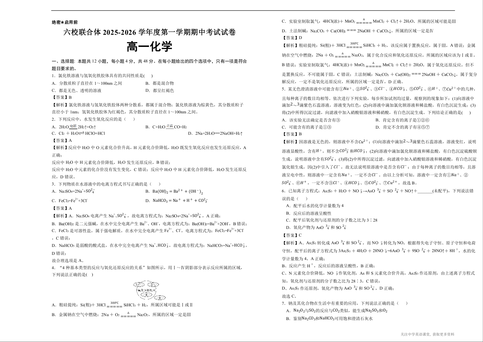 六校联合体2025-2026学年度第一学期期中考试试卷-高一化学答案.docx