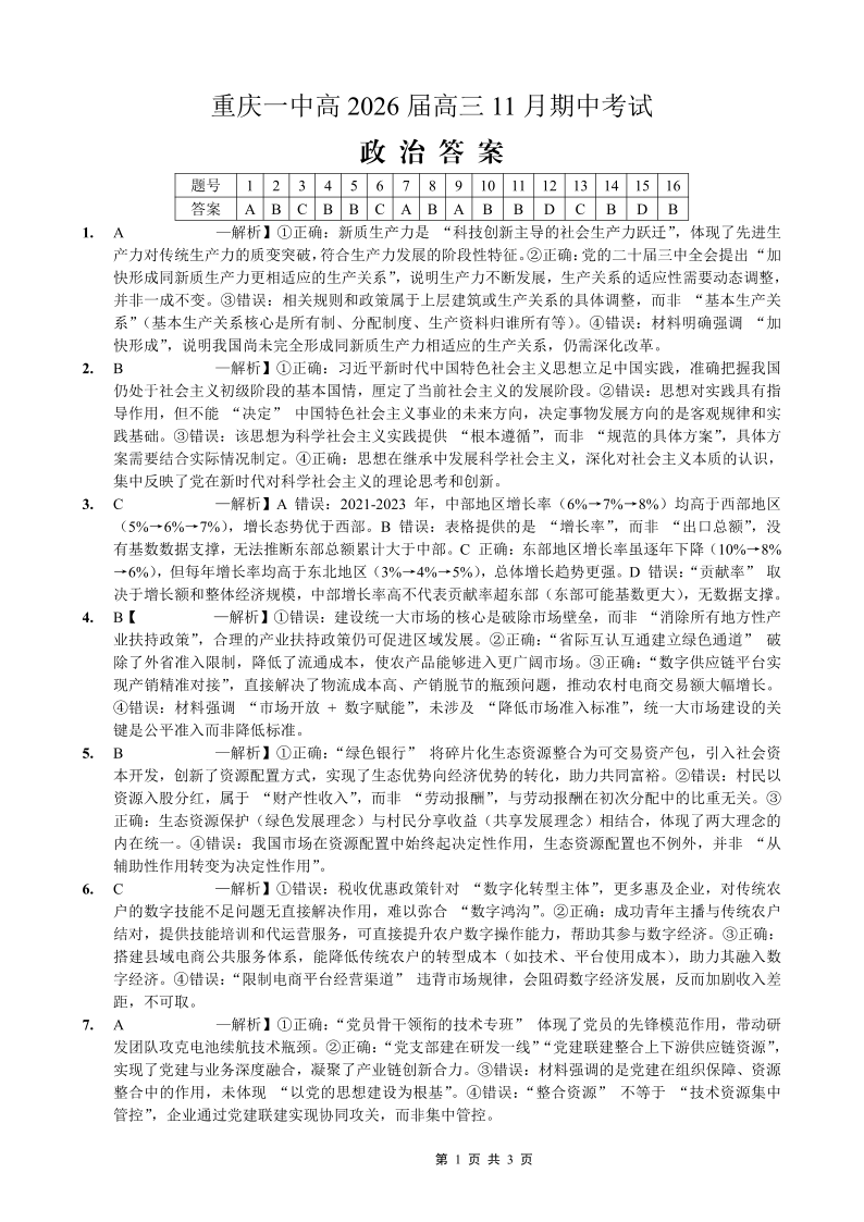 重庆市第一中学校2025-2026学年高三上学期11月月考 政治答案.pdf